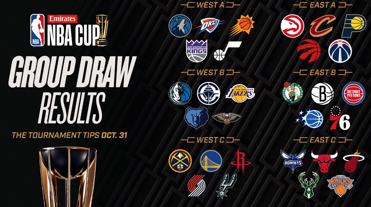 所有30支球队根据2024-25赛季常规赛的胜负战绩被随机抽签分入各自联盟中的五队一组。自11月1日起至11月29日,每支球队将在指定的“杯赛之夜”进行四场小组赛比赛——分别对阵小组中的每一个对手,各打一场,其中两场主场、两场客场。